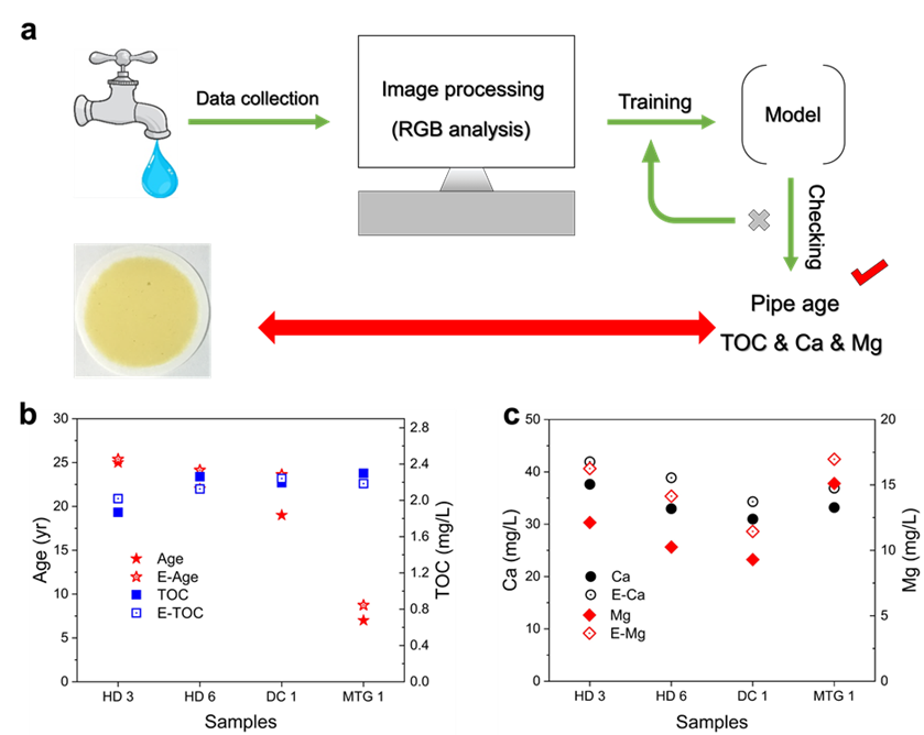 7. a)基于图像识别的管龄及水质预测技术;(b)管龄和有机物及(c)钙、镁离子浓度的预测结果