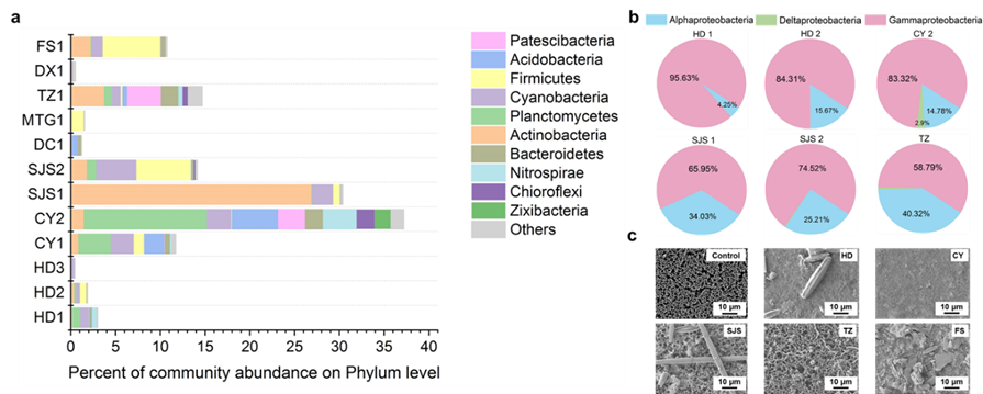 2. 家庭终端自来水微生物多样性(a)细菌群落结构、(b)变形菌门分类;(c)滤膜电镜观测图