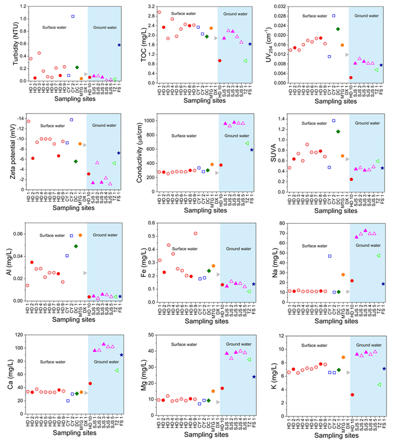 4所示为不同区域的自来水物化指标,其中蓝色背景所示为来源于地下水的自来水样品。可以发现,来源于地下水的家庭自来水浊度、Zeta电位明显较低,但其电导率几乎数倍高于来源于地表水的自来水样品;通过ICP-OES分析发现地下水水源的自来水中钙、镁、钠、钾离子的浓度明显较高,长期饮用高钠含量的自来水可能不利于人体健康。从消毒副产物(SUVA值)的角度出发,使用地下水作为水源加氯消毒后消毒副产物可能更少。