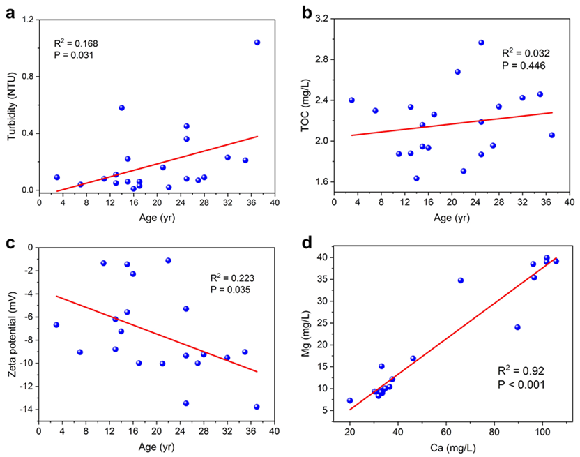 6. 管龄对家庭自来水水质的影响(a)浊度;(b)有机物,以总有机碳表示;(cZeta电位,及(d)钙镁离子浓度共线性分析