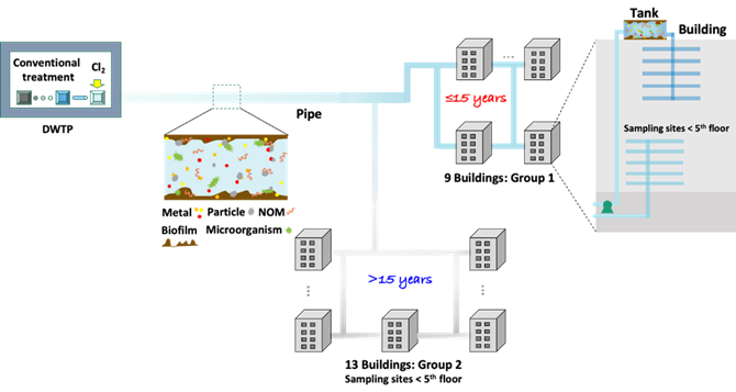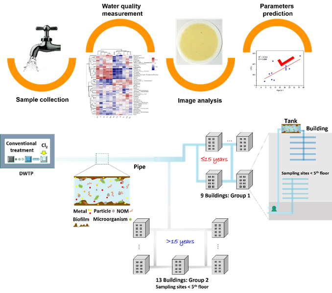 该工作聚焦于建筑内给水管道管龄对家庭自来水水质的影响,老旧的给水管道会降低自来水水质,自来水中微生物的多样性、浊度等指标随管龄的增加而显著增加,开发的基于滤膜的图像识别方法有望能够用于管龄及基础水质信息的快速获取,并在未来更多数据的获取后进一步提升预测的准确性。