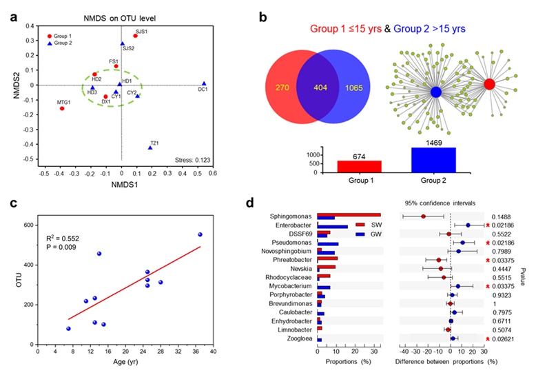 3. 管龄对终端自来水微生物群落结构的影响(aNMDS分析;(bOTUs分析;(c)管龄与微生物多样性的关系;(d)不同原水来源的家庭自来水中的微生物群落结构差异
