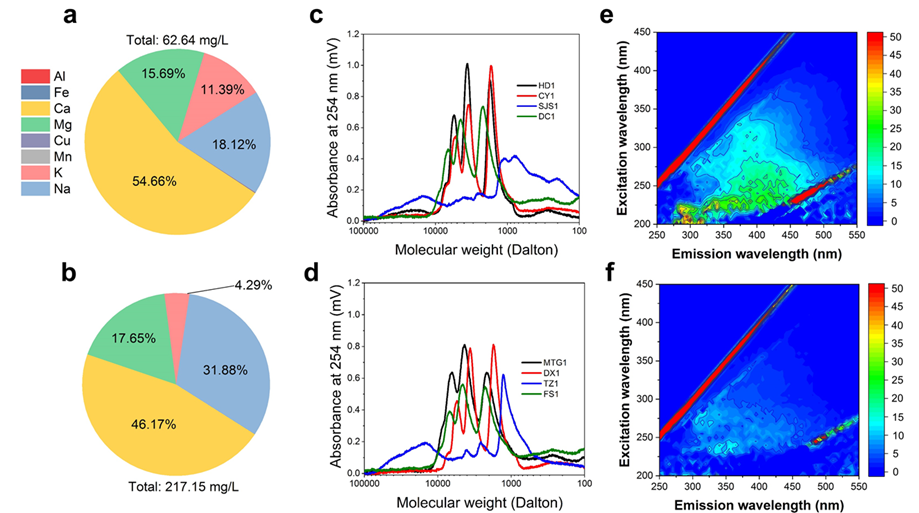 对家庭自来水的常规金属离子(铝、铁、钙、镁、铜、锰、钾、钠)进行检测,占比较高的前4位依次为钙、钠、镁、钾。值得注意的是,地下水源的自来水(图5cSJS1和图5dTZ1)中生物大分子(分子量处于10 ~100 kDa范围)显著高于地表水源的自来水,例如:HD1DX1等;此外两种来源的自来水有机物分子量分布存在显著差异。如图5e所示,三维荧光的分析结果表明地表水源自来水的溶解性有机物明显高于地下水源的自来水(图5f)。