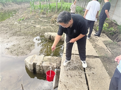 图为山东省济宁市生态环境局汶上县分局工作人员在辖区河道提取水样。 本报记者董若义供图