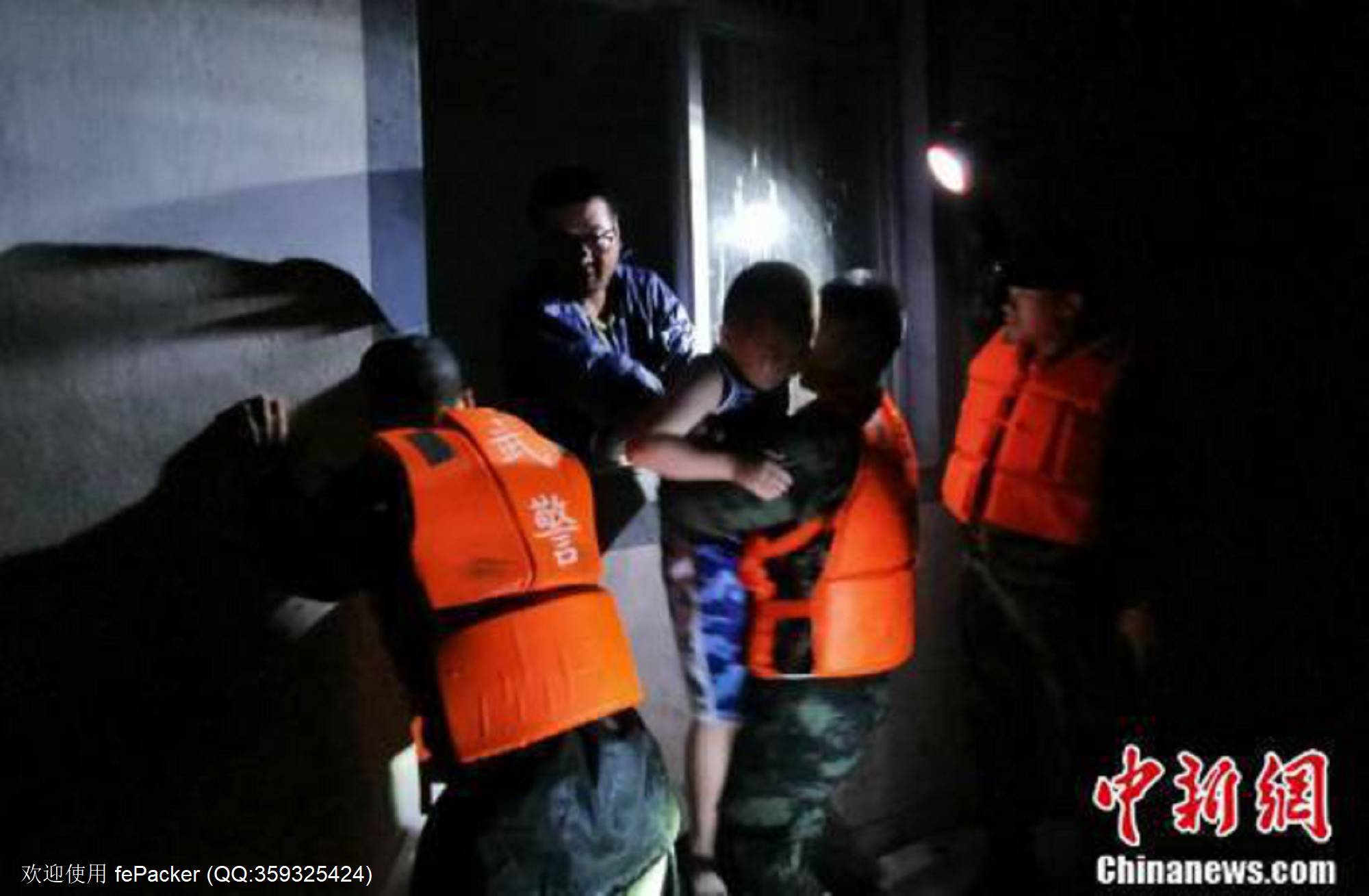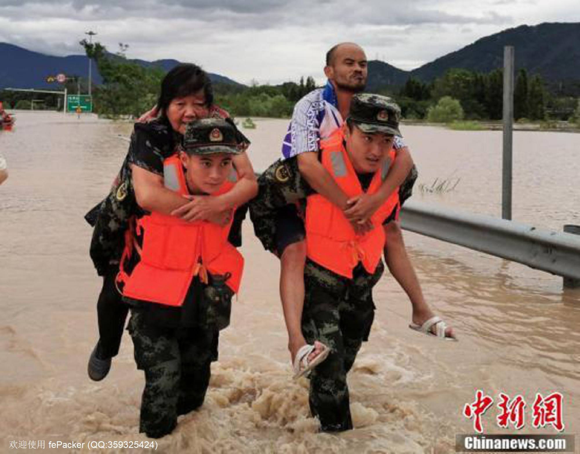 多位官兵在转移洪水中的受困者。中新社记者 沈兵武 摄