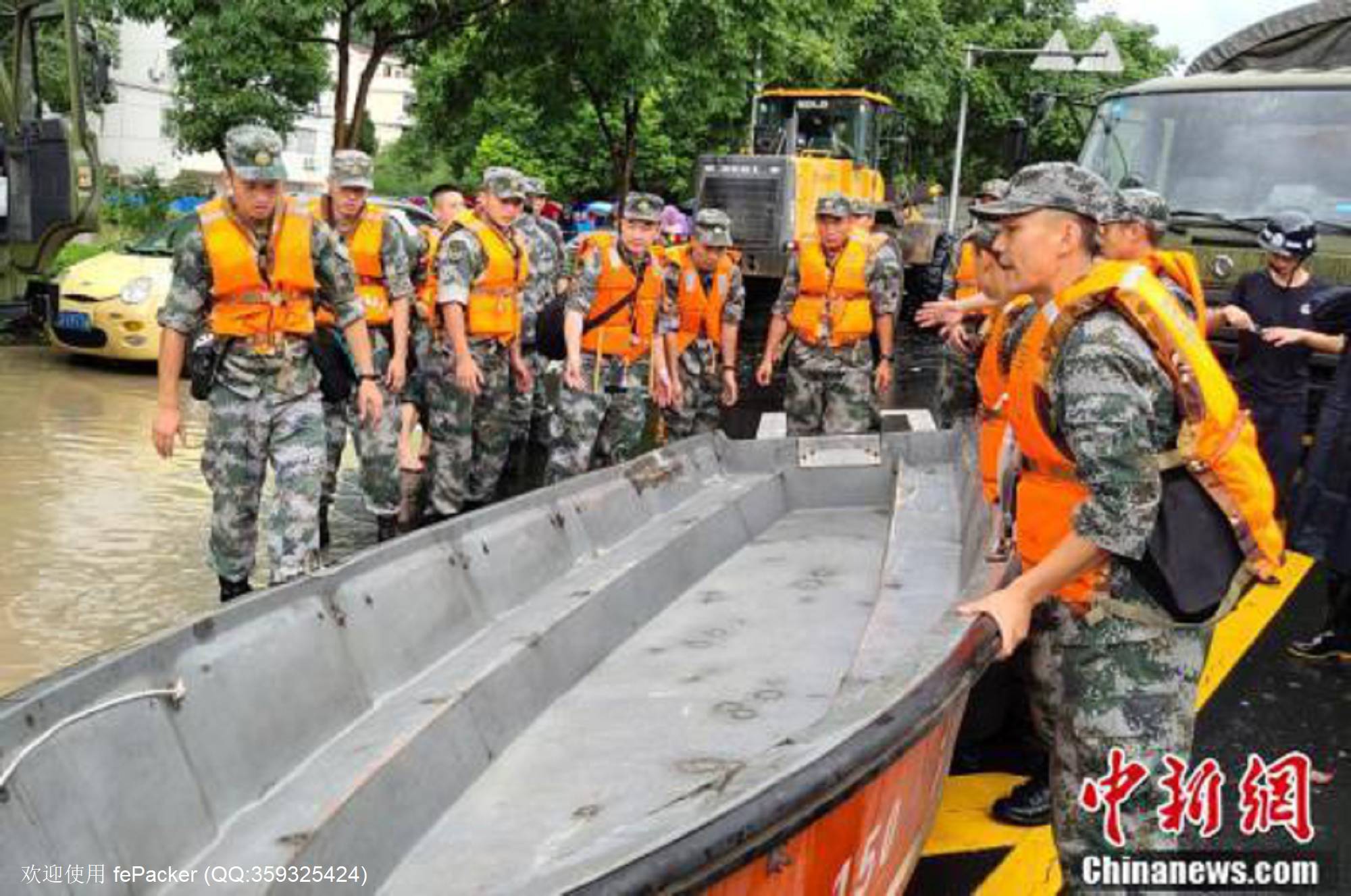 8月10日,众多官兵在准备冲锋舟。当日,受今年第9号台风“利奇马”影响,浙江台州临海多处被淹,民众受困,各方力量紧急出动转移受困民众。  中新社发  李振华 摄