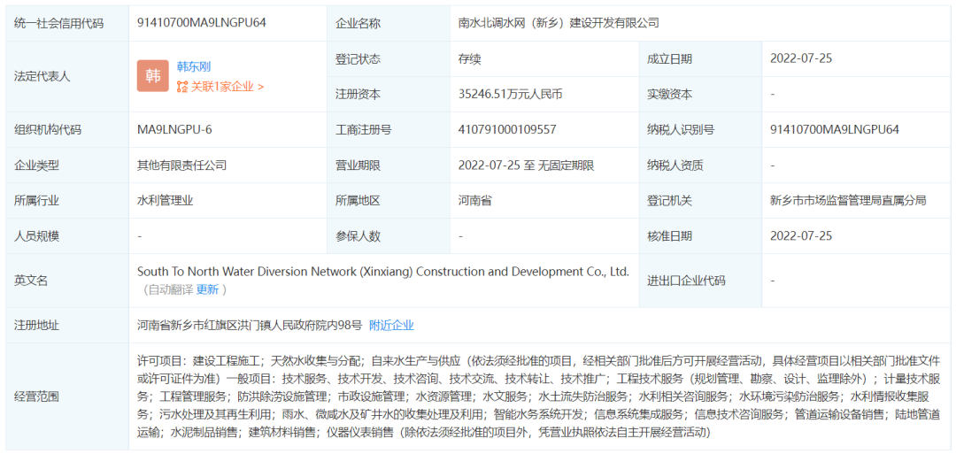 7月25日,南水北调水网(新乡)建设开发有限公司正式成立,注册资本为35246.51万元。