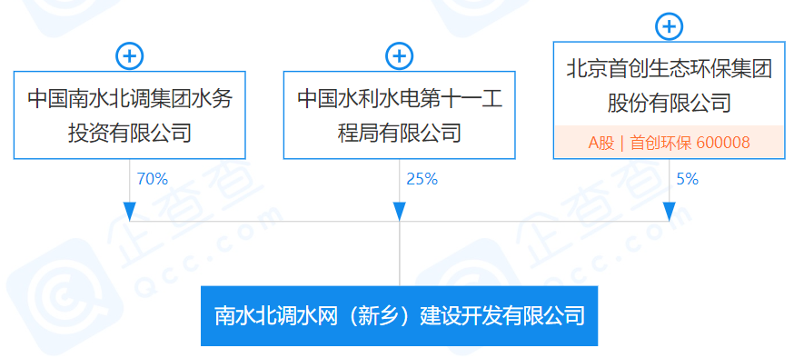 据企查查显示,南水北调水网(新乡)建设开发有限公司由中国南水北调集团水务投资有限公司(持股70%)、中国水利水电第十一工程局有限公司(持股25%)和北京首创生态环保集团股份有限公司(持股5%)合资成立。