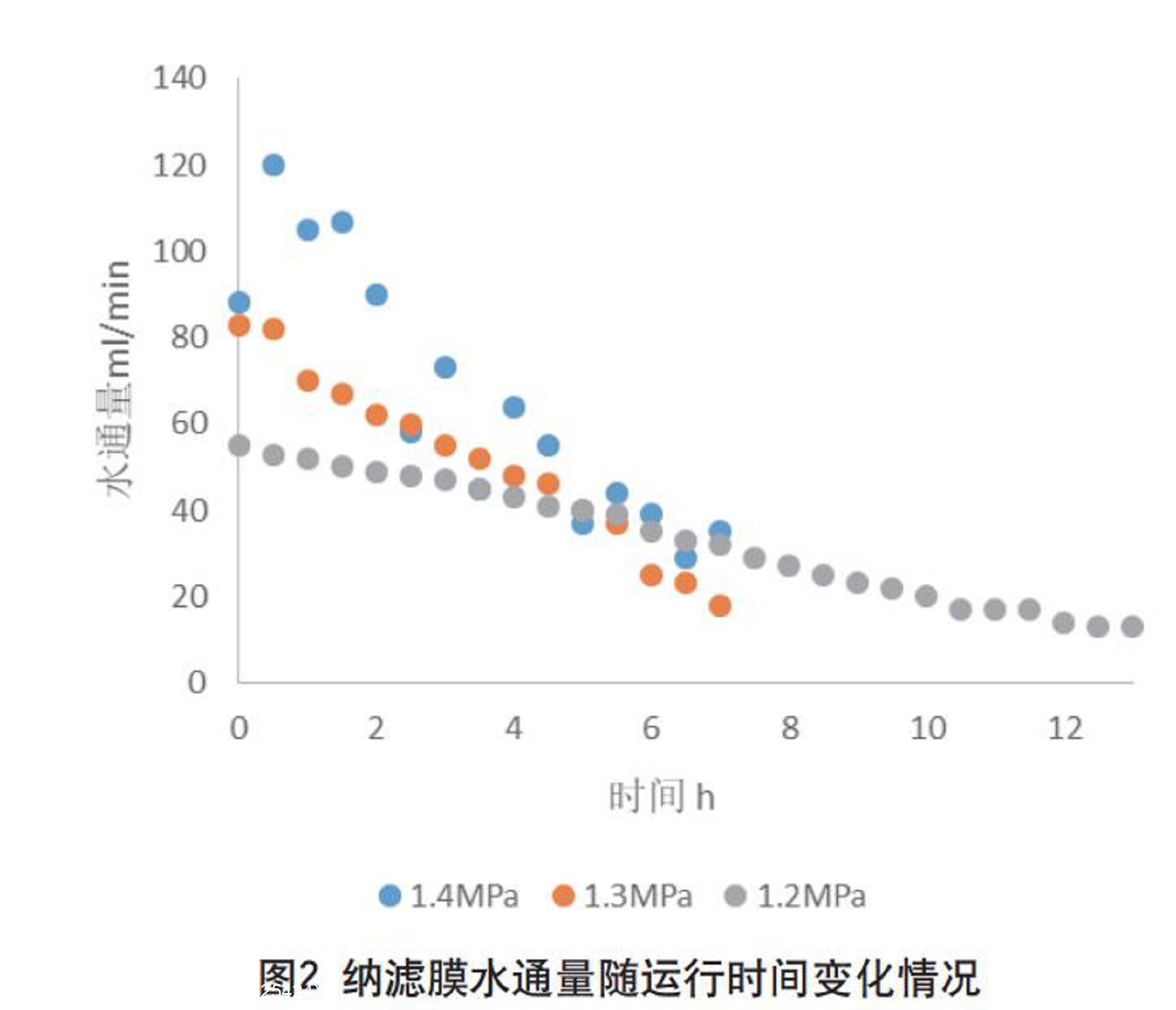 纳滤出水随运行时间呈规律性下降(图2),主要原因是随着运行时间增长料液中的离子浓度(特别是硫酸根离子) 升高,渗透压增大。设备运行60h 并用自来水清洗管路及膜组件后,通量基本恢复至初始通量,说明膜污染不严重且可逆。
